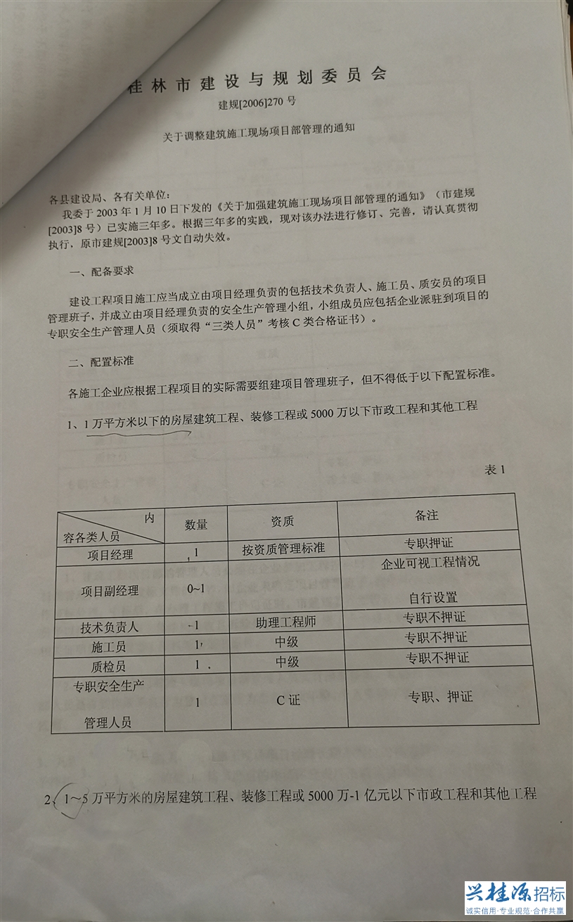 3、桂林建設(shè)與規(guī)劃委員會建規(guī)【2006】270號《關(guān)于調(diào)整建筑施工現(xiàn)場項(xiàng)目部管理的通知》詳見公告附件1。